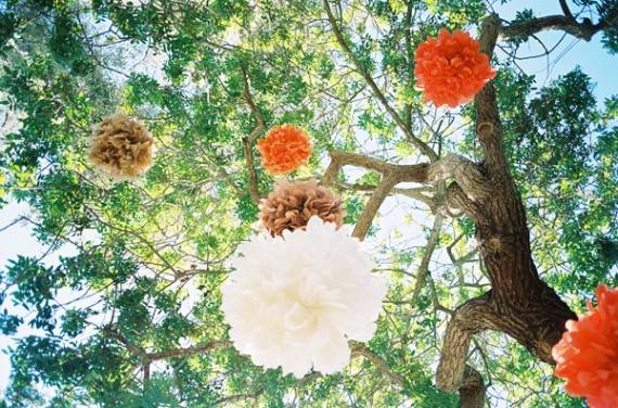 Pompons de papel pendurados nas árvores, um altar civil com apenas três estacas de madeira, suculentas e billy buttons amarelas por todo o lado e mesas corridas com riscas chevron…