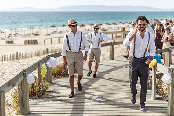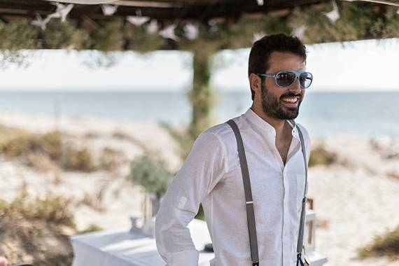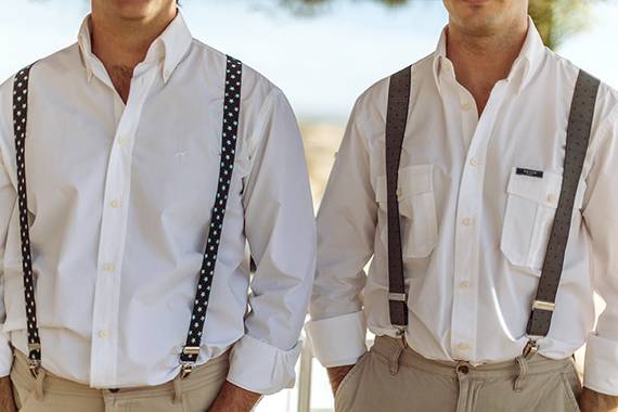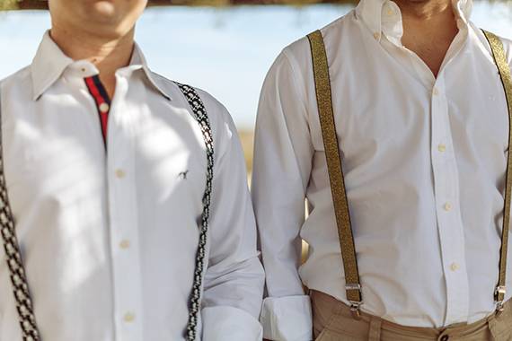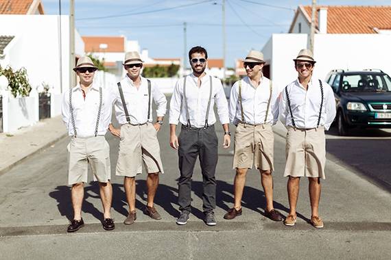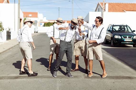 fato do noivo e acessórios: calças e suspensórios da Energy, camisa da Mr Blue e ténis Fred Perry