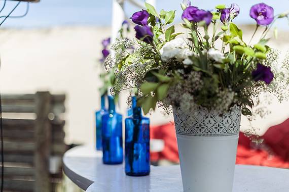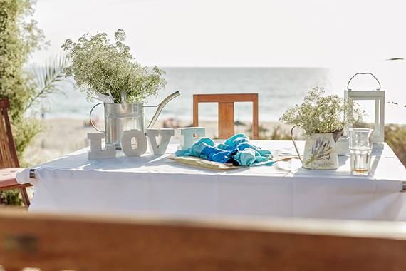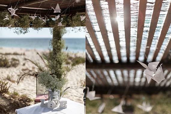 Eu acho que tanto a Praia da Comporta como o restaurante são tão bonitos que o ambiente já estava criado. A partir daí seriam apenas necessários alguns pormenores de decoração, numa linha romântica e delicada, com flores brancas e campestres, com vasos brancos, regadores, alguns corações e flores de papel, sem grandes exageros.
