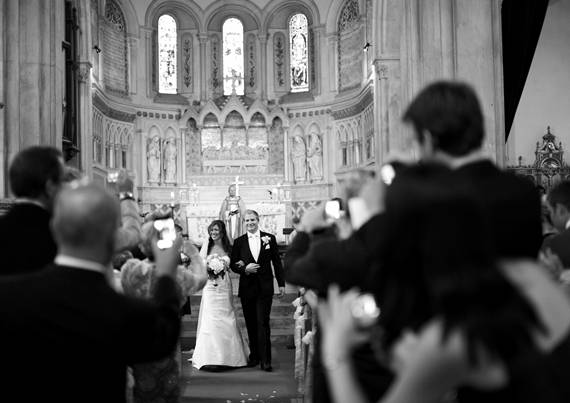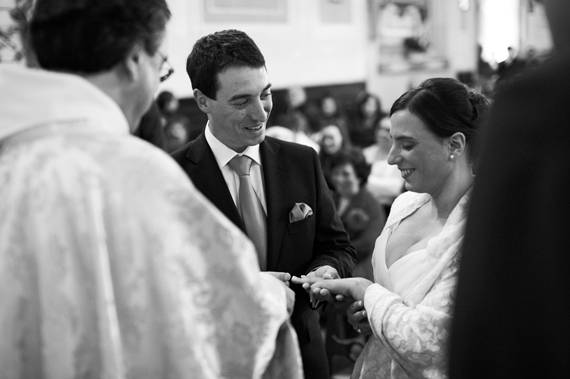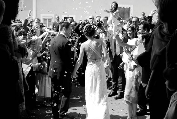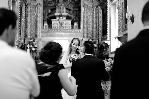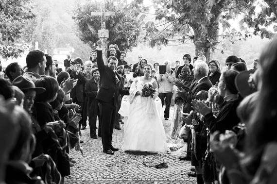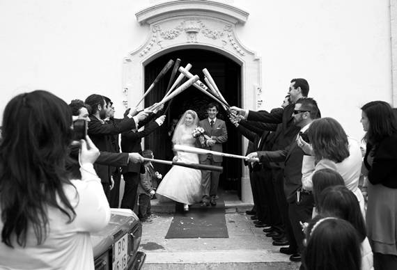 Escolhemos esta imagem por ser um momento importante, a saída da Igreja, mas acima de tudo porque é rica em interacções e tem como ponto central os noivos. Não lhes pedimos que se virassem para trás, também não pedimos às pessoas para ficarem assim arrumadas para criar um corredor para os noivos depois de eles passarem, o normal seria que isso não tivesse acontecido. Mas aconteceu e permitiu captar este momento de forma tão rica. Os noivos estão a agradecer e a comunicar com os seus familiares e amigos, há convidados a documentar o momento com as suas câmaras, há sorrisos, há olhares, há cumplicidade, escuteiros a comporem os seus lenços depois de os terem atirado ao ar momentos antes, um senhor a espreitar através de um livro, há aplausos: há narrativa.
