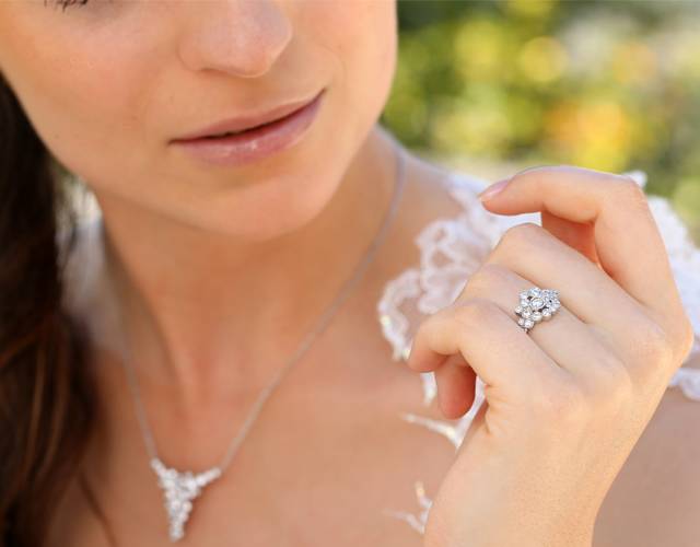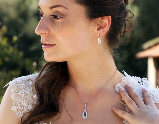 Composta por 6 conjuntos, que incluem colares, brincos e anéis em ouro branco com cravação de zircónias brancas, estes acessórios de noiva românticos podem ser usados em conjunto, sozinhos ou num mix mais pessoal, combinando perfeitamente com vários estilos de vestido de noiva e penteados, dos mais tradicionais aos mais modernos. Simples, delicados e elegantes, são ainda peças que vão acompanhá-la muito para além do dia do casamento, uma memória única para usar e recordar sempre que quiser.